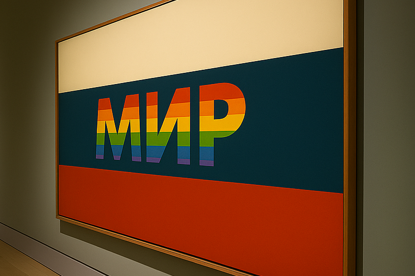 Su questa ambivalenza si fonda il cuore dell’opera. La parola Мир — che in russo significa sia pace sia mondo — campeggia al centro della bandiera della Federazione Russa. Le lettere, perfettamente uniformate, sono attraversate da una sfumatura verticale che racchiude tutti e sette i colori dell’arcobaleno (viola, indaco, blu, verde, giallo, arancione, rosso), simbolo universale della pace e dell’inclusione.